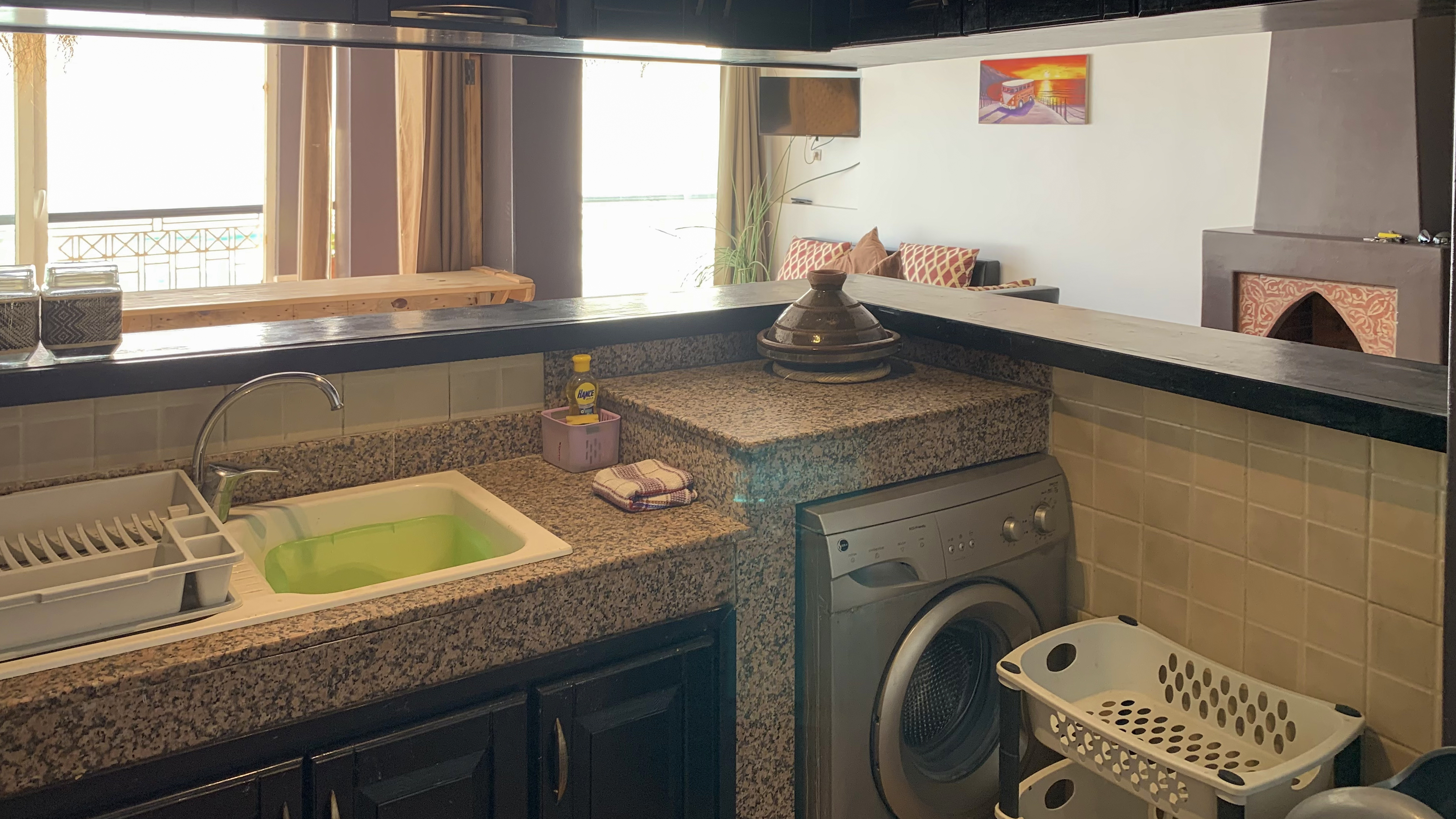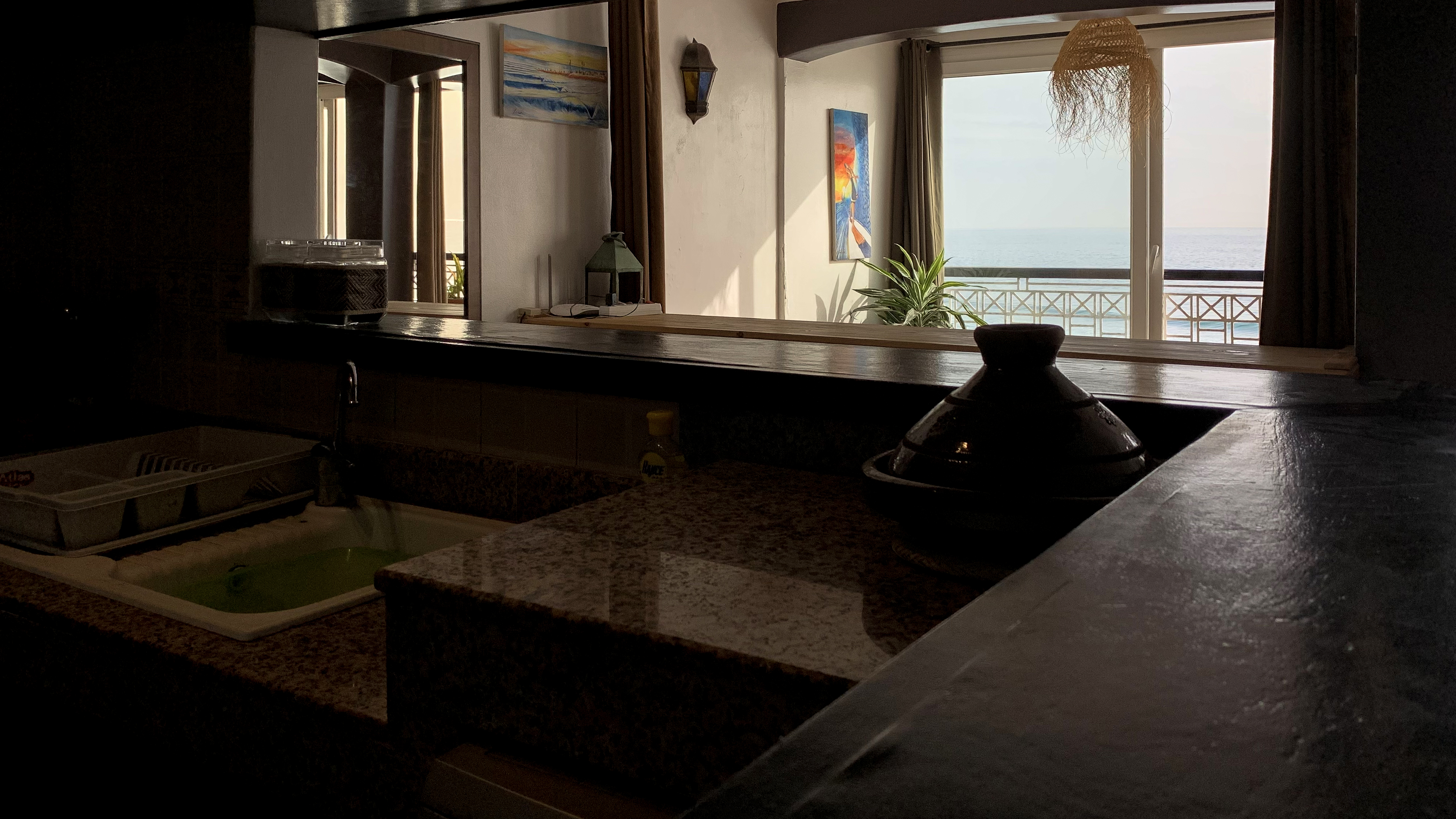 une douzaine de marches, et vous entrez dans un grand espace de vie donnant directement sur l'océan par deux baies vitrées. La cuisine est ouverte sur ce grand espace avec son bar en bois face à la mer, A droite, le coin repas avec un canapé TV et, comme toujours, une superbe vue sur l'océan. Au fond à gauche, un salon séparé par un paravent en bois et faisant office de deuxième chambre, canapé convertible ou canapé et table basse pour lire ou juste profitez de l’océan.